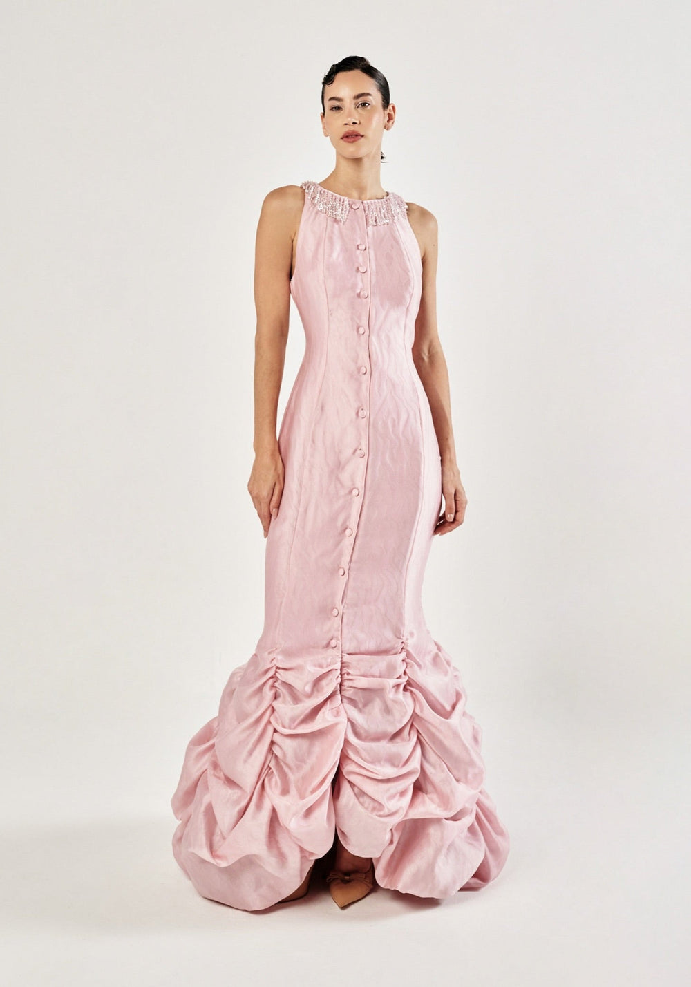 For every collection we work with a good selection of fabrics that compliment each other but drape and feel in a special way. Being based in Dubai, it’s impossible not to think about multiculturalism and consequently making sure to offer a range of choices that also extend to the cuts and fits of our designer dresses.