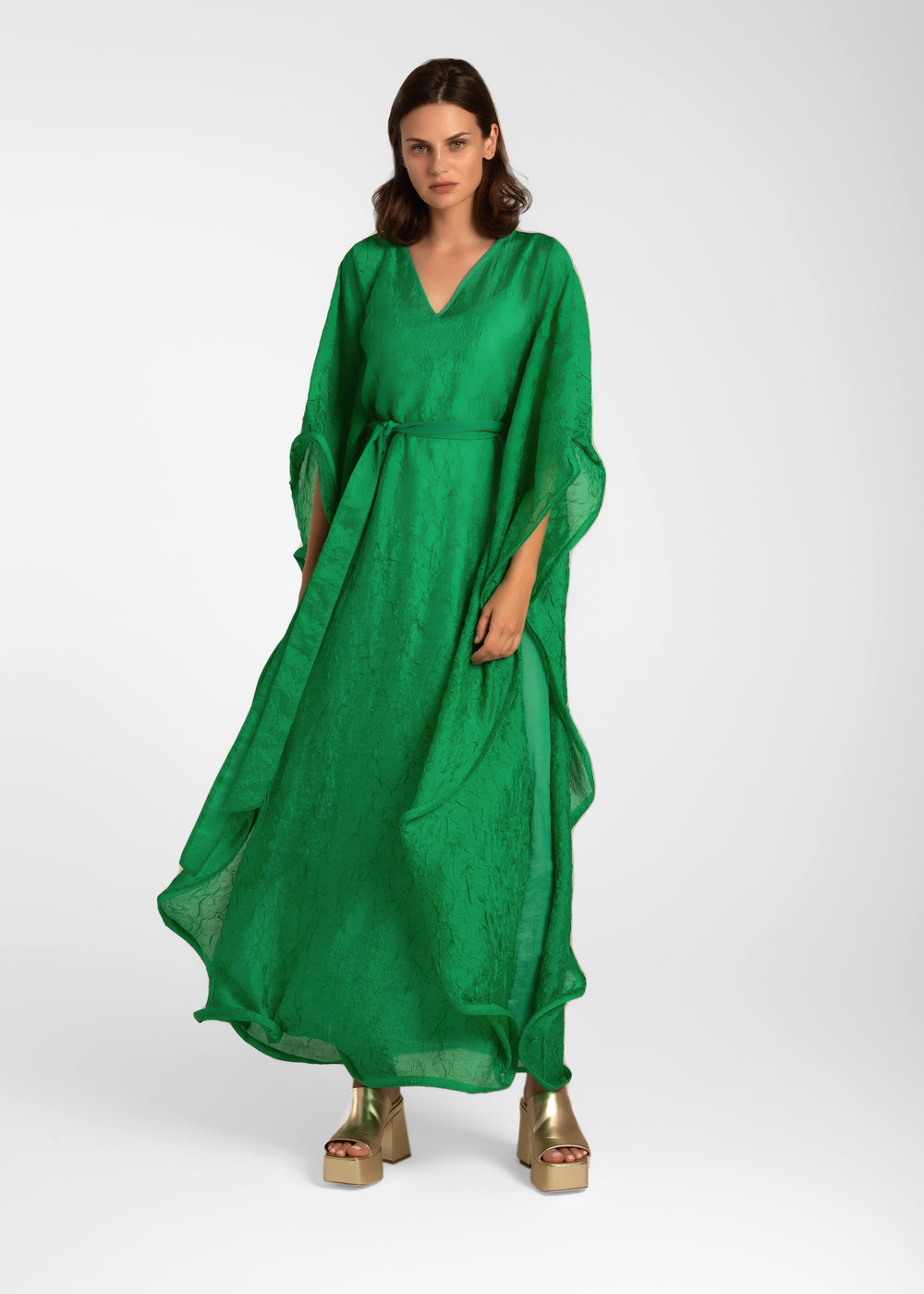Maxi kaftan made of soft wrinkled organza fabric with swirly sides. It has attached ties at the front to accentuate the waist and a Separate jersey lining.