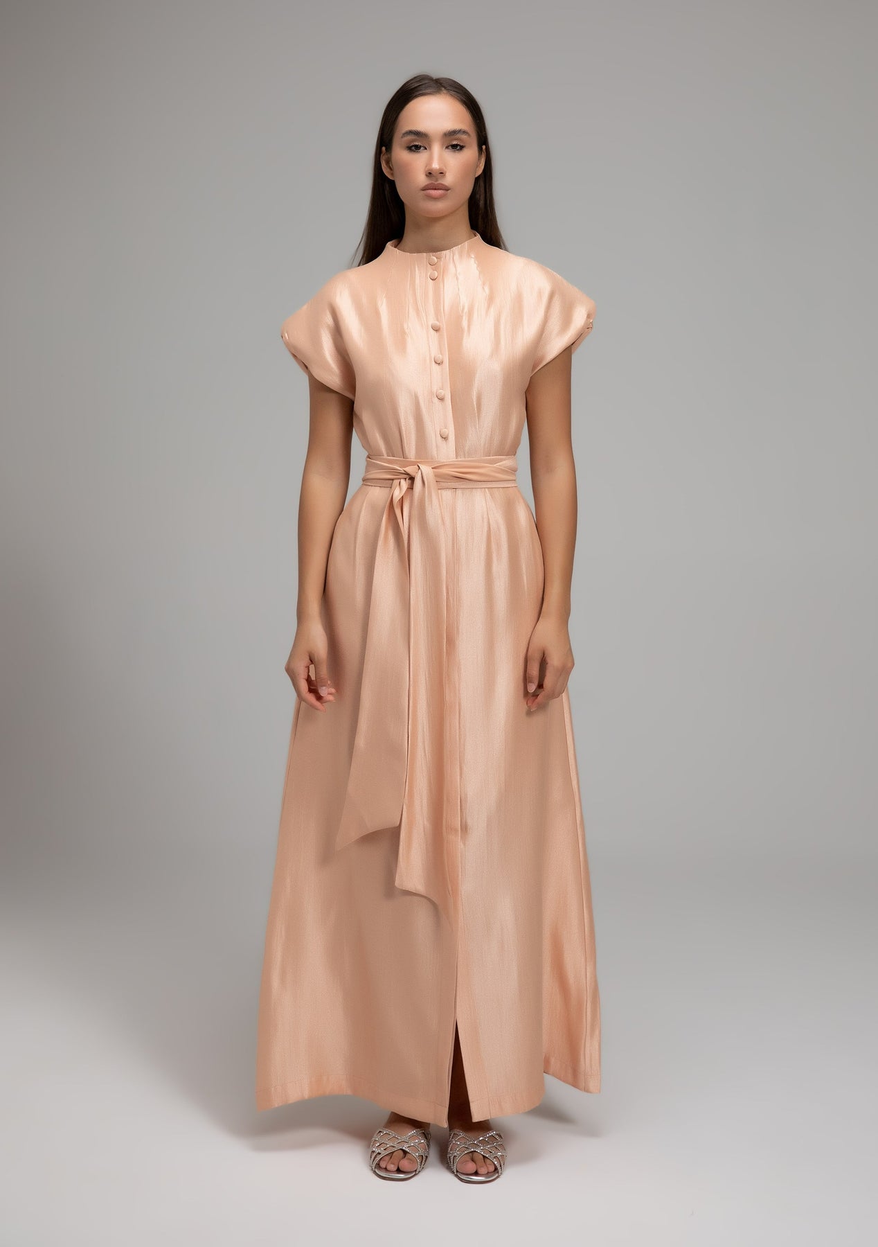 Button-down maxi dress with high neck-line and dropped shoulders. The dress is made of luxurious metallic fabric and is lined with soft rayon fabric for extra comfort.